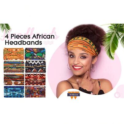 4条装非洲发带,打结宽版防滑瑜伽弹力头巾发带,运动印花头巾发饰,适合女性和女孩 - 彩色 - 查看 4