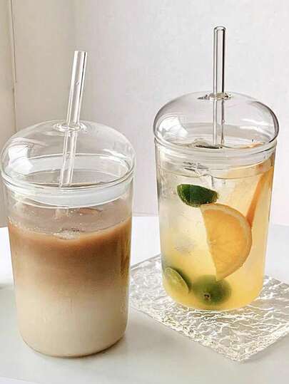 450毫升透明玻璃杯带盖和吸管,玻璃果汁/饮料/咖啡杯,简约水杯 - 彩色 - 查看 1