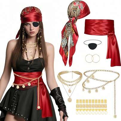 47件套女士海盗服装配饰套装 - 包括海盗头巾、红色腰带、腰链、项链、耳环和发饰,适合日常穿着、节日、派对和角色扮演 - 彩色 - 查看 1