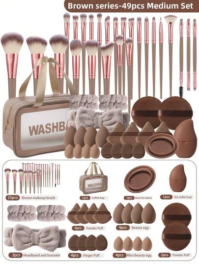 49件套专业化妆工具套装,包含25支柔软化妆刷、防水多功能拉链化妆包、化妆海绵、迷你海绵、三角粉扑、气垫粉扑、发带腕带、刷子清洁器、面部冰敷袋、圆形粉扑,女士全能美妆套装
