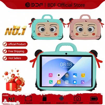 4GB 运行内存 + 64GB 机身存储 / 7 英寸儿童平板电脑 / 四核 1.3GHz 处理器 / 安卓 13 系统,MTK8321 芯片 / 1280x800 IPS 高清屏幕 / 200 万像素 + 500 万像素双摄像头 / 4000mAh 大容量电池 / 支持 WiFi 家长控制和教育游戏 / 采用 ABS 塑料 + 硅胶材质 BDF N1 儿童教育平板电脑(包含:包装盒 / 数据线 / 说明书 / OTG 转接线 / 读卡器)