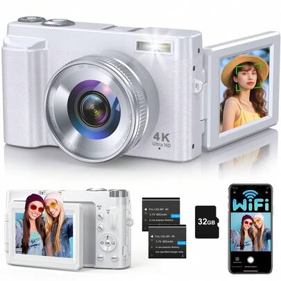 4K数码相机,适用于摄影 - WiFi 64MP Vlog相机,自动对焦视频相机,3英寸180°翻转屏,16倍数码变焦,便携式Vlog旅行相机,附赠32GB SD卡和2块电池 - 查看 4