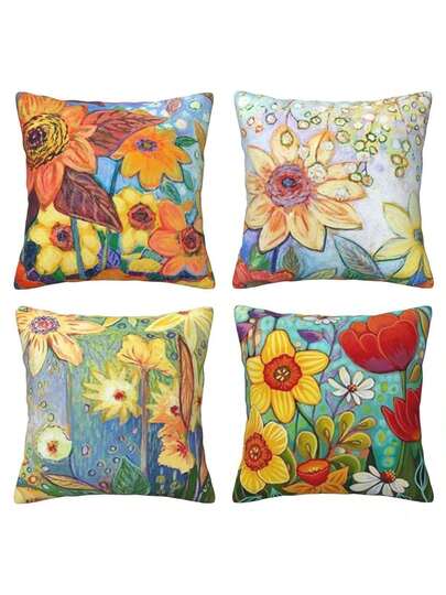 4入組墨水油畫水彩花蕾裝飾性抱枕套,適用於家居客廳床鋪沙發汽車靠背,棉麻款正方形18 X 18 英寸 - 彩色 - 查看 4