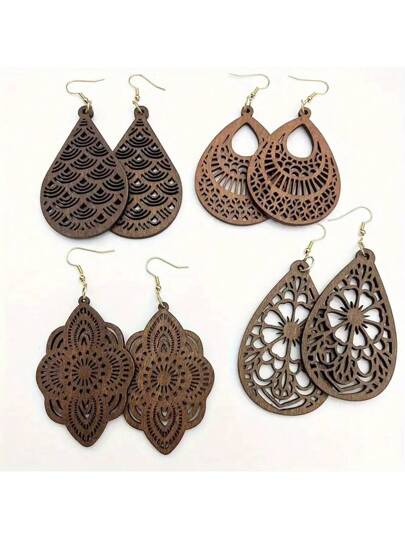 4對/組木質復古別緻耳環 - 棕色 - 查看 4