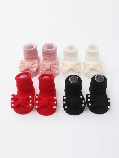 4雙/包 嬰兒女孩公主蝴蝶結裝飾防滑地板襪,純色中筒襪 - 彩色 - 查看 1