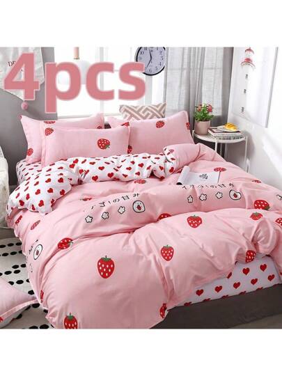 4 件套芦荟棉草莓图案床上用品套装,1*床单 + 1*羽绒被套 + 2*枕套,无枕头/被子填充物,亲肤、柔软舒适、简约设计 - 粉色 - 查看 4