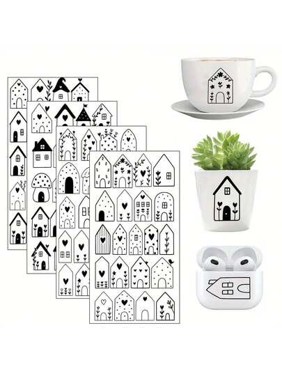 4张圣诞小屋主题卡通乙烯基贴纸,自粘式,带闪光,混合颜色不规则形状,哑光表面,适用于DIY家具、玻璃、玻璃器皿、瓶子、工艺品,是圣诞装饰的理想之选,一次性使用 - 彩色 - 查看 1