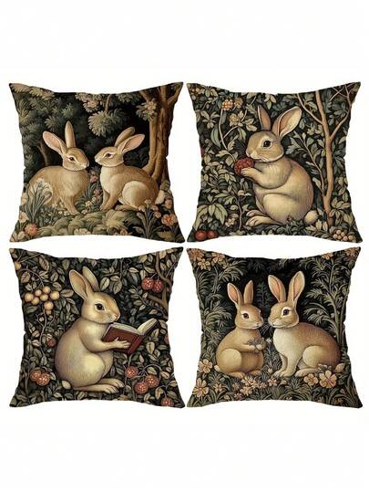 4 件套双面复古花卉兔子印花抱枕套,可机洗涤纶材质,拉链封口,植物兔子浆果图案,适用于沙发卧室装饰,45x45厘米 - 卡其色 - 查看 4