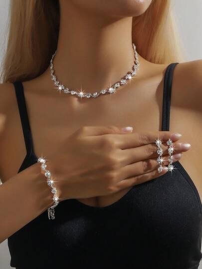 4件套奢华水钻珍珠项链、耳环和手链首饰套装,适合新娘、婚礼礼物、日常通勤、聚会、度假佩戴,优雅百搭。 - 4件/套 - 查看 5