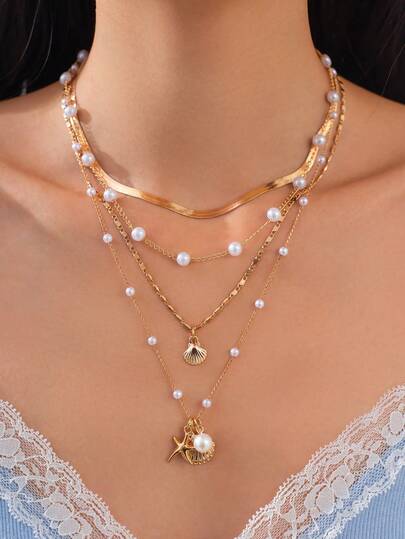 4件套海洋假日几何精美链条仿珍珠串珠扁平蛇形链海星扇贝吊坠项链,优雅奢华,适合婚礼、派对、海滩、休闲、街头风格,女士及情侣皆宜,节日及生日礼物 - 金色 - 查看 1