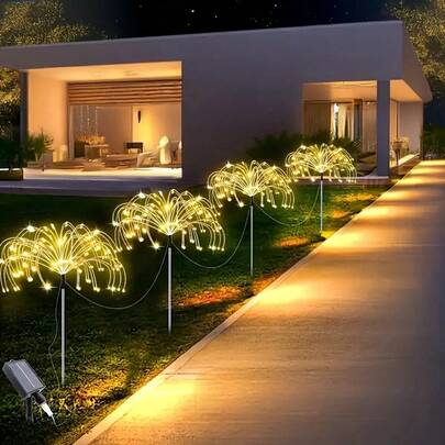 4件套户外太阳能烟花灯,8种不同照明模式,IP65防水,适用于婚礼、别墅、庭院、露台、小径和草坪等场所。