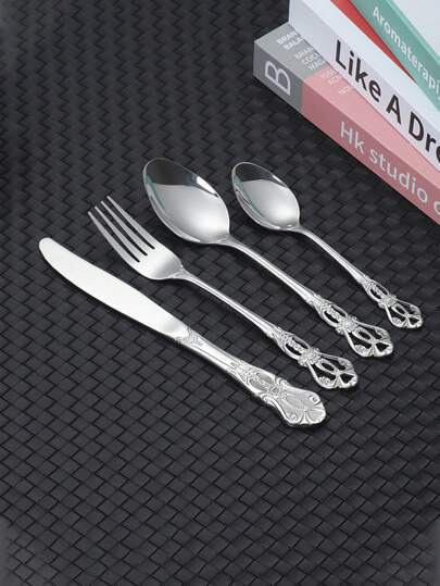 4入組復古英國宮廷風格銀餐具組(304),高端西式皇家餐具組,不銹鋼中空浮雕手柄湯匙叉刀,可使用洗碗機 - 銀色 - 查看 1