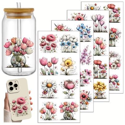 4张/套 梦幻花卉春季主题UV转印贴纸 | 自粘塑料贴纸,适用于工艺品、马克杯、笔记本电脑和水瓶,红色,高品质印刷,耐用,一次性使用 - 彩色 - 查看 6