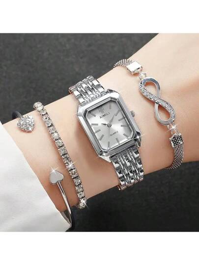 4 件套女士休闲商务简约风格石英表与手链组合,方形表盘手表套装 - 銀色 - 查看 1