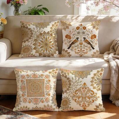 4件套复古经典花卉图案单面印花抱枕套,装饰枕套,适用于客厅、沙发、卧室,不含枕芯 - 彩色 - 查看 4