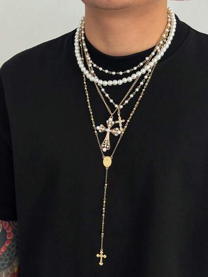 4件套复古嘻哈十字架吊坠仿珍珠项链,Y字形项链套装,可单独佩戴或叠戴,男士魅力饰品,适合日常、音乐节、派对等场合,男女皆宜,理想礼物 - 金色 - 查看 1