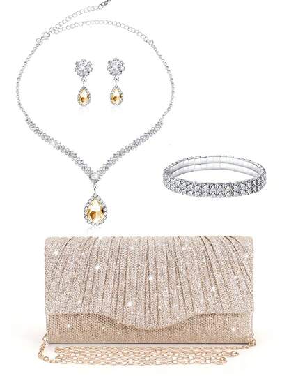4 件套女士时尚百搭褶皱手拿包、奢华水钻项链、耳环、手链首饰套装,适合派对佩戴 - 香檳色 - 查看 4