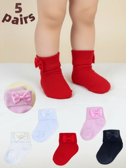 5双装婴儿纯色短袜,新年袜,经典红、黑、白、粉、米色,饰有蝴蝶结,色彩鲜艳,柔软舒适,适合春、夏、秋季日常穿着,适合0-3岁宝宝,节日袜,精美礼物,情人节袜 - 彩色 - 查看 5