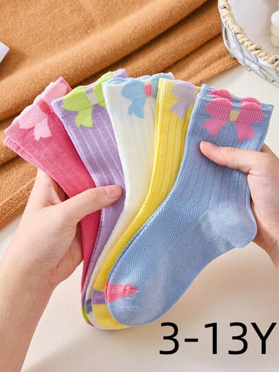5双春夏季儿童袜子,女童可爱蝴蝶结中筒袜,彩虹色短袜,夏季网眼透气袜子,超薄夏季袜子 - 彩色 - 查看 5