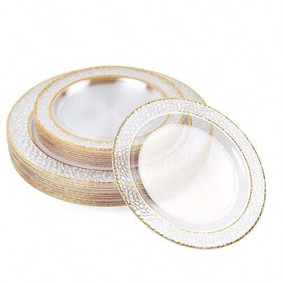 50/25/12个透明金边餐盘 - 优雅的金边餐盘,可堆叠设计,节省空间。适用于婚礼、生日派对、户外聚会和日常用餐。产品特点包括:抗皱材质、坚固结构,用途广泛,可用于活动策划、家庭聚会、节日庆典、派对等场合,也是餐厅供应商的理想之选。 - 查看 5