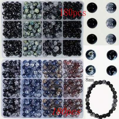 50颗/180颗/360颗 8毫米黑色水晶玻璃珠首饰制作套装,适用于DIY友谊手链、项链、耳环、工艺品、串珠入门套装(颜色随机)