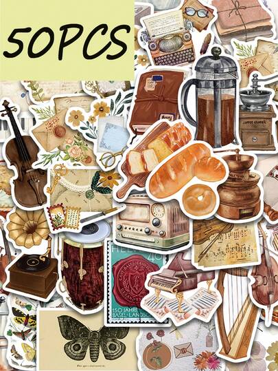 50张复古时光日记系列贴纸,适用于装饰手机、笔记本、头盔,防水贴纸 - 彩色 - 查看 6