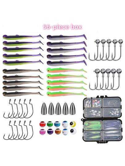 56件套路亚钓具套装,包括德州钓组、弯钩、子弹铅坠、带尾软饵和蚯蚓钓线