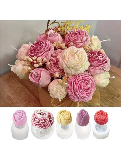 5件套花束硅胶模具 - 逼真玫瑰牡丹花蜡烛模具,适用于树脂、肥皂和粘土工艺品 - DIY婚礼和节日礼物制作材料 - 可重复使用的不粘家居装饰模具 - 無色 - 查看 6