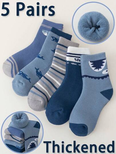 5 双儿童卡通鲨鱼厚款保暖中筒袜,适合秋冬季 - 彩色 - 查看 1