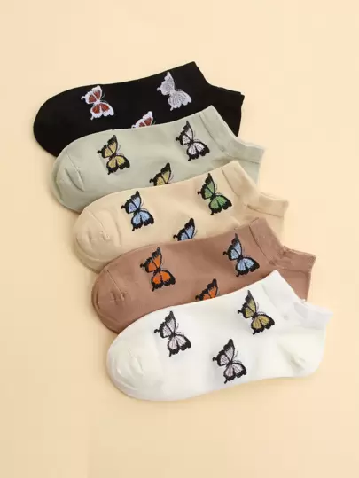 5双女士蝴蝶图案船袜,春夏季 - 彩色 - 查看 1