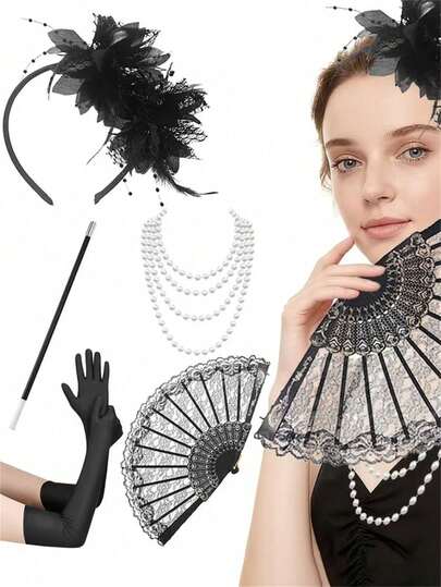 5件套1920年代女士服装配饰套装,复古别致派对装扮配饰,包括项链、手套、头饰、手持道具,复古风格,适合节日、化装舞会等场合。