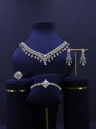 5件套奢华皇家风格水滴流苏新娘首饰套装,包括项链、手链、耳环、戒指,适合日常婚礼佩戴,结婚周年纪念礼物(附赠金色礼盒) - 白色 - 查看 1