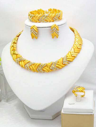 5件套 时尚水晶18K镀金迪拜珠宝套装 项链 耳环 戒指 手链 女士非洲新娘珠宝配饰礼品 - 橘色 - 查看 5