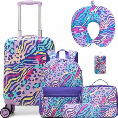 5件套女孩旅行行李套装,适合8-10岁女孩,包含可爱背包、斜挎包、儿童背包套装、旅行背包,适合小学生,可装学习用品(颈枕和提手随机发货)