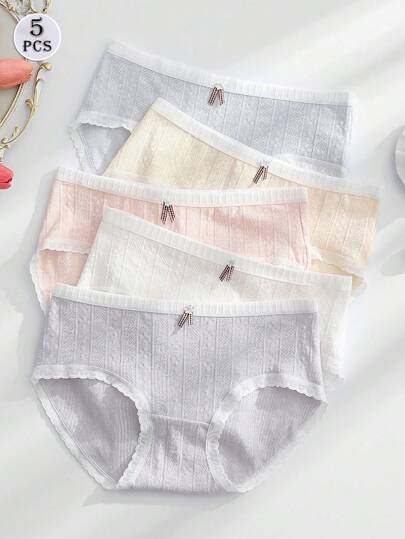 5条装女士可爱蝴蝶结装饰中腰透气舒适纯棉内裤,白色和粉色,学生基础款内裤,生日礼物 - 彩色 - 查看 5