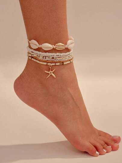 6/7 件波西米亚风格海滩海星、贝壳和米珠弹性脚链套装,夏季 - 彩色 - 查看 1