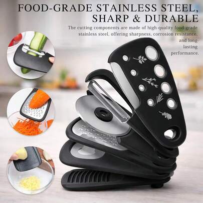黑色六件套独特厨房小工具套装,可堆叠节省空间,包括刨丝器、削皮器、披萨刀和开瓶器