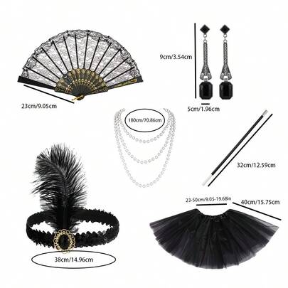 6件套1920年代优雅名媛复古扇子、手套和发饰套装 - 别致复古化装舞会手套配饰套装 - 单人派对服装及配饰4件套