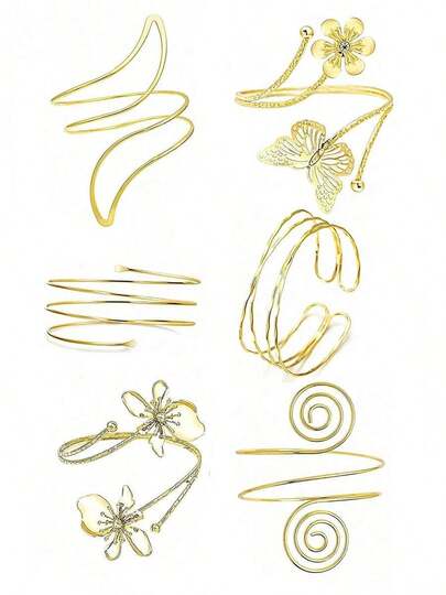 6pcs/Set Adjustable Metal Silver Simple Geometric Spiral Arm Cuff Bracelet Set, Summer Vacation Style, Halloween Decoration