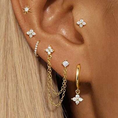 6件套铜镀金闪亮锆石百搭经典时尚耳环,女士款 - 梅花鋯石 - 查看 7