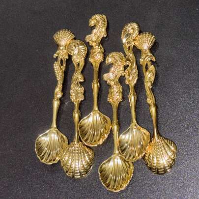 6件套复古银色海洋主题咖啡勺 - 金鱼、贝壳、珊瑚浮雕设计,优雅的下午茶甜点勺,适合居家使用和送礼 - 彩色 - 查看 7