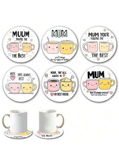 6个装圆形木质杯垫,母亲节设计,印有“妈妈,你是最棒的”字样,配以笑脸咖啡杯和心形图案,直径10厘米,耐热,是送给妈妈的完美母亲节礼物。 - 彩色 - 查看 6