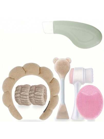 7 件套硅胶面部护理套装 - 深层清洁面膜刷套装,包括柔软毛绒头带和毛绒腕带,温和去角质双面面部刷,双头双面面膜刷,黑头去除器,女士便携式护肤工具,情人节、圣诞节的理想礼物 - 棕色 - 查看 1