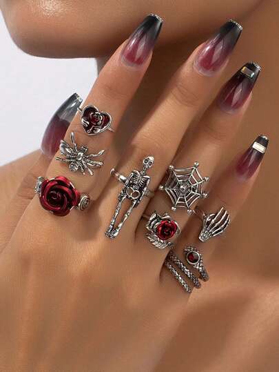 8件套哥特式玫瑰骷髅吸血鬼蜘蛛可叠戴戒指套装,情人节女士礼物 - 彩色 - 查看 1
