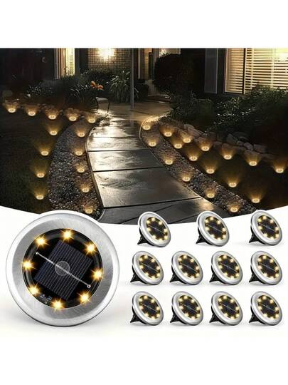 8 件 LED 太阳能路径灯、地面灯、户外防水景观灯、太阳能圆盘灯、防水花园小径走道草坪景观灯、太阳能落地灯 - 黑色 - 查看 8