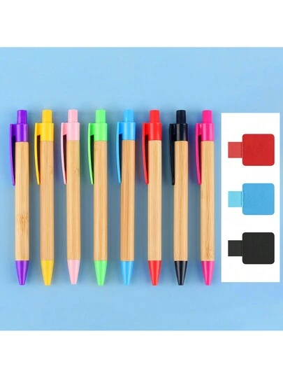 6. 8支筆+3入筆夾的矩形塑料盒裝多色點擊式竹質圓珠筆,適用於辦公室、學習,具有仿木紋圖案的筆身和1mm筆尖,是辦公用品類的日常用品