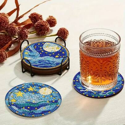 8件套钻石画杯垫套装,含底座,月亮和星星图案,成人钻石画艺术,圆形钻石木质底座带隔热杯垫,适合家居装饰、办公桌配件、情人节礼物 - 彩色 - 查看 1