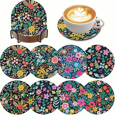 8件套DIY钻石画花朵杯垫套装,圆形闪亮钻石表面,强力背胶,工具齐全,适合初学者,减压手工,新年、情人节、圣诞节、教师节礼物,家居装饰杯垫,送给家人、朋友、女朋友、老师