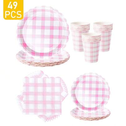 8件套粉白格纹花卉图案一次性餐盘、餐巾纸、纸杯 - 一次性派对用品套装,适合8位客人,一次性纸盘,派对餐具,适用于生日、婚礼、野餐等场合。 - 彩色 - 查看 8