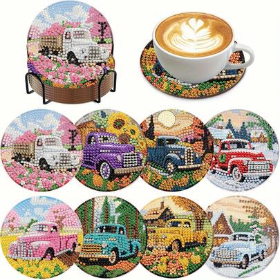 8件套卡车DIY钻石画杯垫套装,圆形亮面钻石,强力背胶,工具齐全,适合初学者,减压手工,新年、情人节、圣诞节、教师节礼物,家居装饰杯垫,送给家人、朋友、女朋友、老师